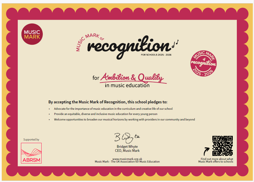 We are delighted to have been awarded with our Music Mark for another year. This is awarded by Kent Music School in recognition of outstanding music provision. We have been commended for our rich, exciting, high-quality and engaging music curriculum and the additional musical experiences we provide for all children. The Music Mark celebrates schools that also influence others in understanding the important contribution that music makes in every school and makes established relationships with professionals within the music sector and the wider community of music educators.